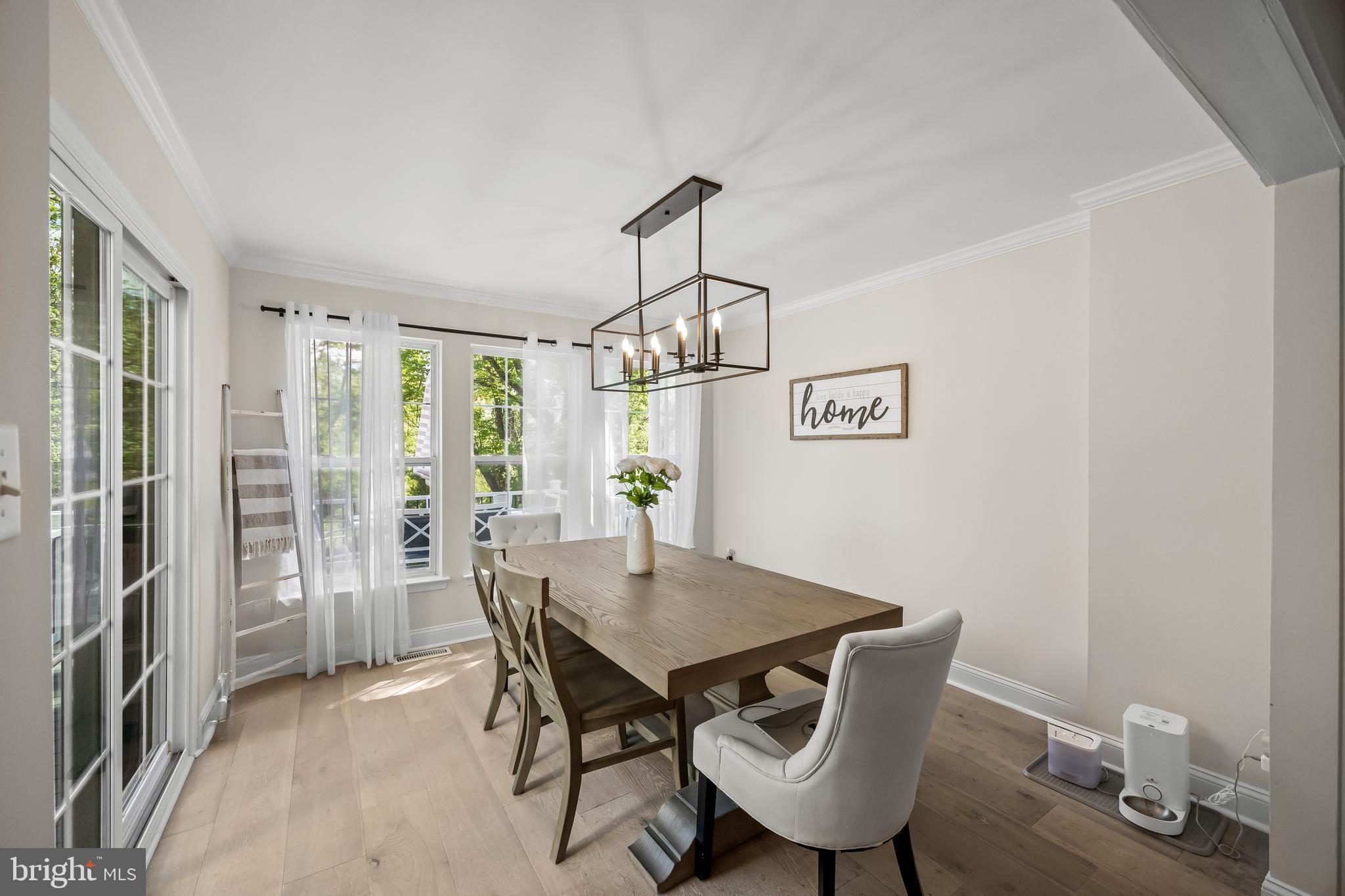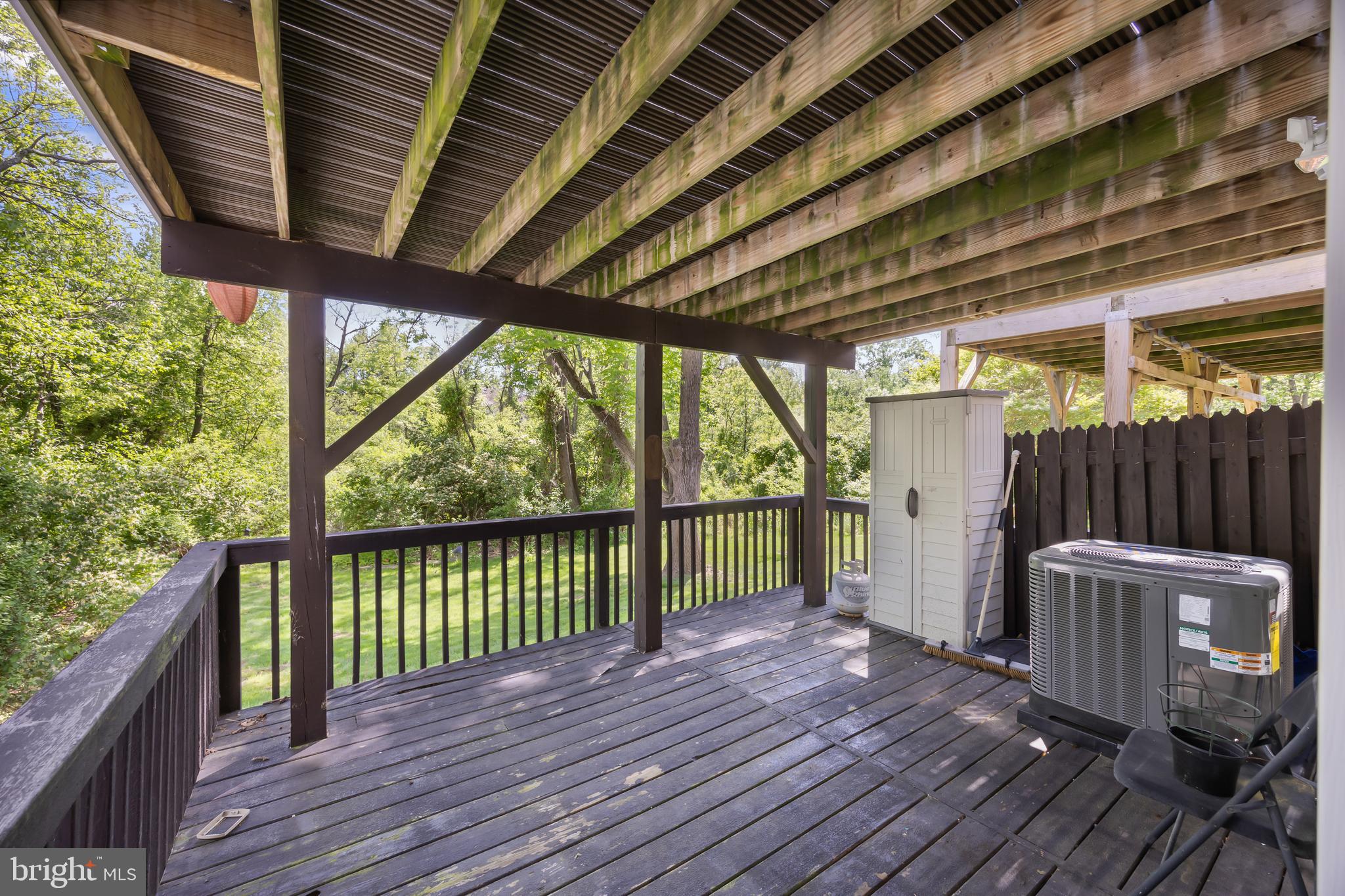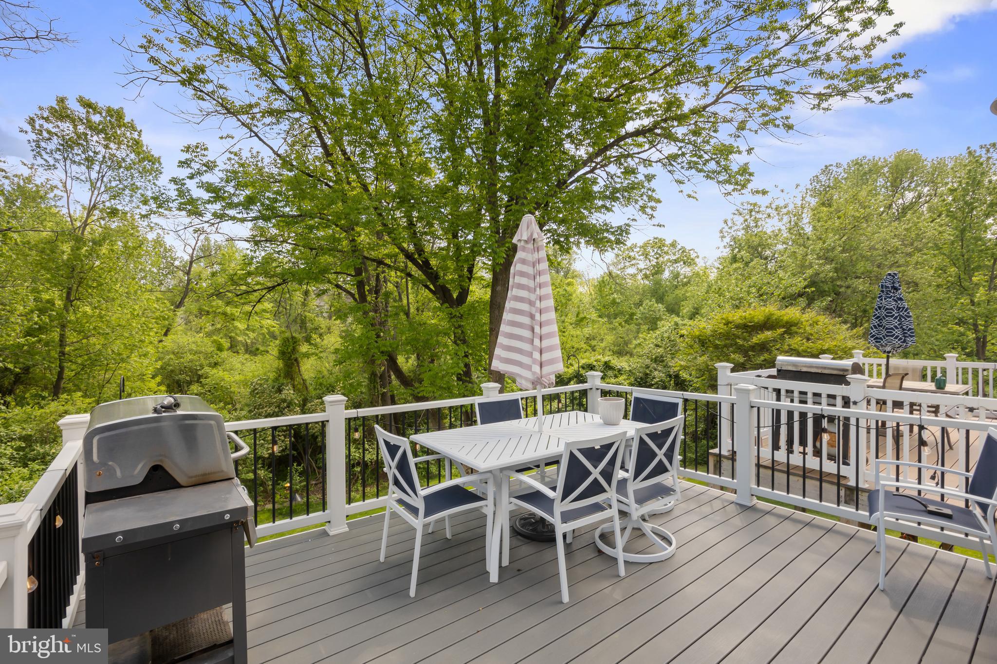 The formal dining room, open and flooded with light, features a sliding glass door that leads to a newly redone upper deck with Trec composite decking. This space offers serene, wooded views, providing a peaceful retreat amidst nature.