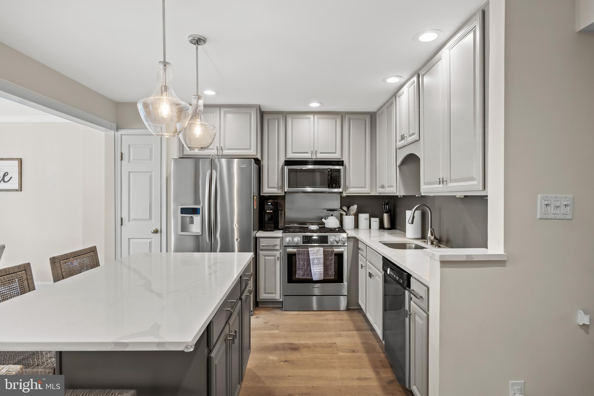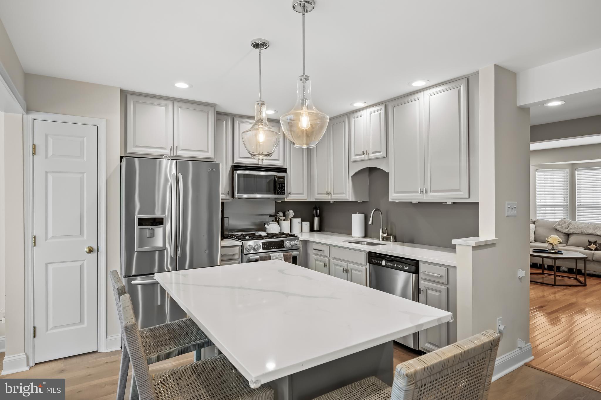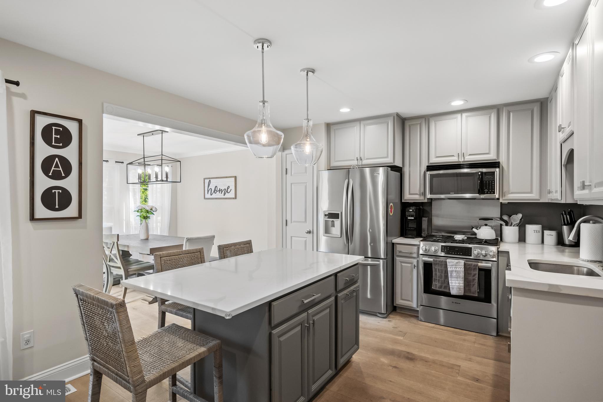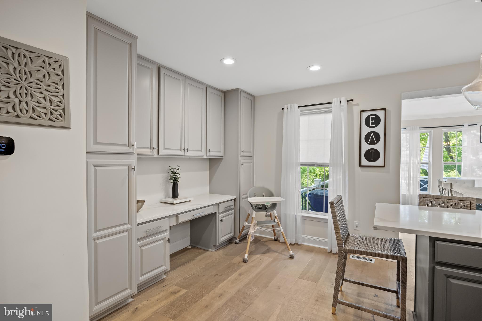 Enter into the main floor, where an oversized living room greets you with its warm hardwood floors and a stunning bow window that bathes the space in natural light. The convenient half bath adds a touch of practicality to this inviting area. Transition seamlessly into the gorgeous, bright, and airy kitchen, boasting a massive island and abundant cabinet storage. The premium quartz countertops and stainless steel appliance package are perfect for culinary creativity or casual dining. This area is complemented by a bonus area offering additional storage and a dedicated desk space.